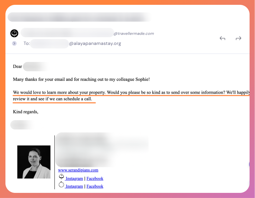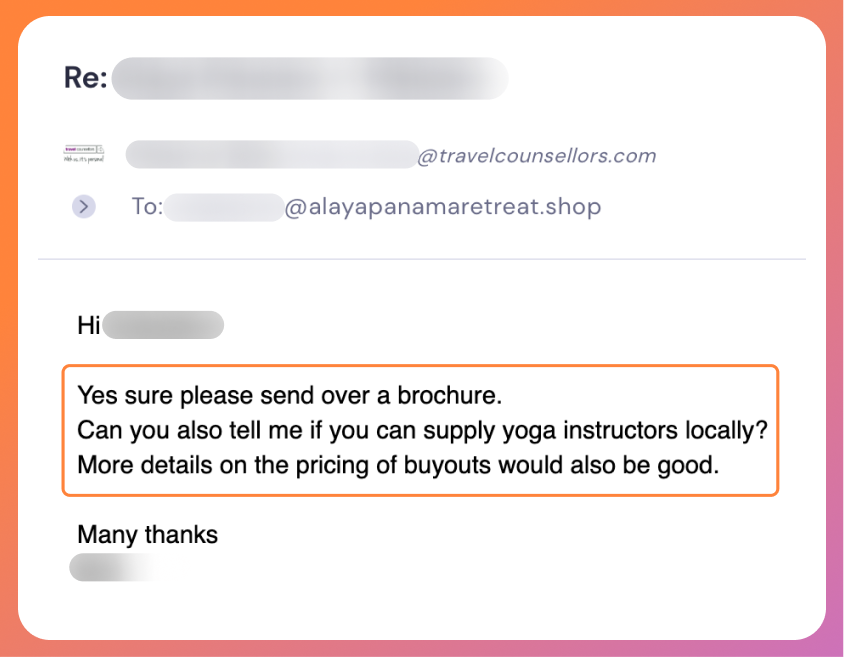 Despite having a beautiful location and the right facilities, Alaya Panada struggled to attract serious retreat organizers or event planners. Their main outreach approach was contacting influencers and yoga instructors on Instagram — a strategy that led to little traction and no sustainable bookings.